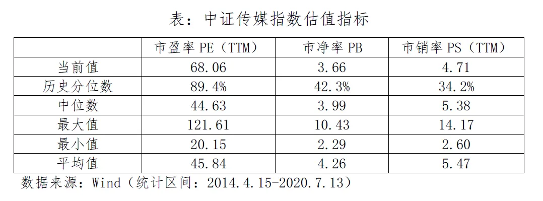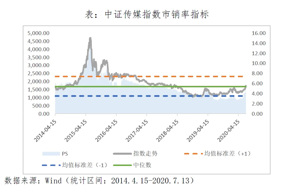 截至2020年7月13日,中证传媒指数动态市盈率PE(TTM)为68.06倍,位于指数上市以来89.4%历史分位数。然而,作为成长型行业,其市场并未完全成熟稳定,因此市盈率指标并不能很好的反映其发展前景,因此使用市销率PS(TTM)估值更为合适;可以看到的是,市销率PS(TTM)与指数的走势也更为贴近。当前中证传媒指数市销率PS(TTM)仅为4.71倍,位于指数上市以来34.2%历史分位数,处于历史较低位置,因而具备较好的配置价值。
