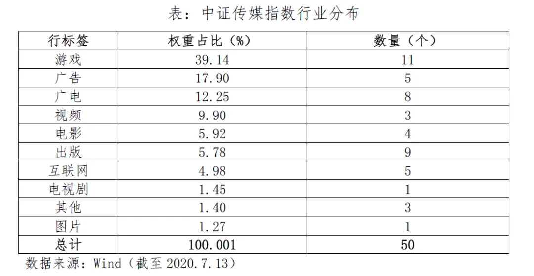 根据指数编制规则,中证传媒指数主要从中证全指中选取与传媒相关的上市公司作为候选标的。在实际分类中,一般可以根据公司主营业务将其分为游戏、广告、视频等行业。中证传媒指数中与游戏相关的公司权重占比最大。