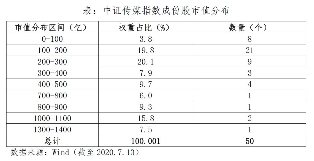 从指数成份股的市值分布来看,中证传媒指数的组成以中小市值企业为主;其中,300亿以下市值的企业数量达到38个,数量占比76%,权重占比43.7%。