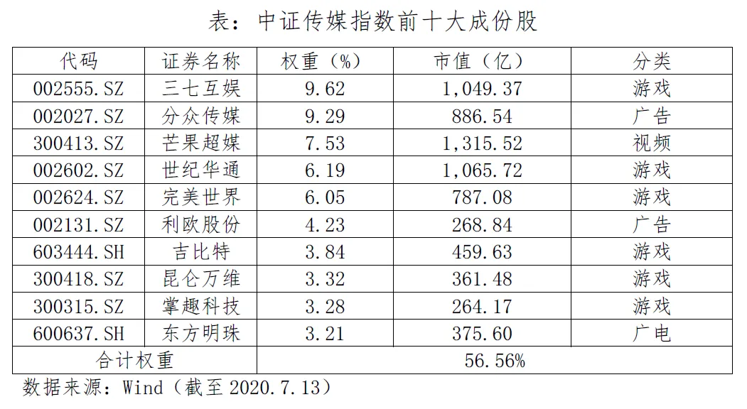 中证传媒指数成份股集中度较高,前十大成份股权重合计占比56.56%,以游戏公司为主。
