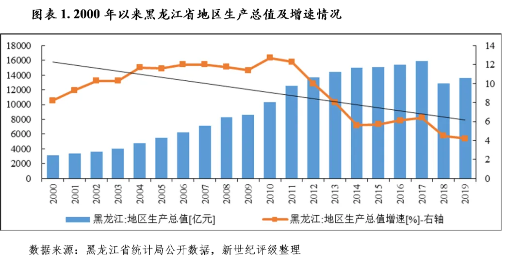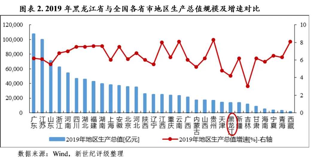 建国初期,国家通过集中投资,在东北地区建设了以原材料、能源、装备制造为主的工业基地,东北地区形成了以资源型产业以及制造业为主的产业体系,成为新中国工业的摇篮。近年来,因资源衰竭、产业结构问题突出、人口老龄化以及人才流失等原因,东北经济呈现衰退态势,其经济发展与东中部省份之间的差距逐步拉大。黑龙江省作为我国重要的能源和粮食产地,受传统产业持续衰退、新兴替代产发展滞后以及体制机制改革有待深化等因素影响,经济下行压力较大。2019年,黑龙江省实现地区生产总值1.36万亿元[3],经济规模位居全国各省市第24位,排名较上年下滑3位[4];按可比价格计算,同比增长4.2%,增速下降0.3个百分点,低于全国平均增速1.9个百分点。当年,黑龙江省人均生产总值为3.62万元,亦低于全国平均水平(7.09万元)。
