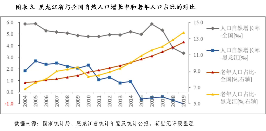 黑龙江省已呈现收缩型社会的特征,2015年全省自然人口增长率出现断崖式下跌,而老年人口占比自2011年起持续较快提高,2014年超过全国平均水平,且幅度持续走阔。人口流失以及人口老龄化加速已对黑龙江省劳动力供给、消费需求释放形成不利影响,且加重了地方政府在养老、社会保障等非生产性支出的财政负担。2019年末,黑龙江省常住人口3751.3万人,较2018年末减少21.8万人,省人口自然增长率为-1.01‰。从年龄结构看,劳动力年龄人口(15~64岁)占比较上年下降0.6个百分点至75.9%,65岁及以上人口占全省总人口的比重为13.8%,较上年提高0.9个百分点。