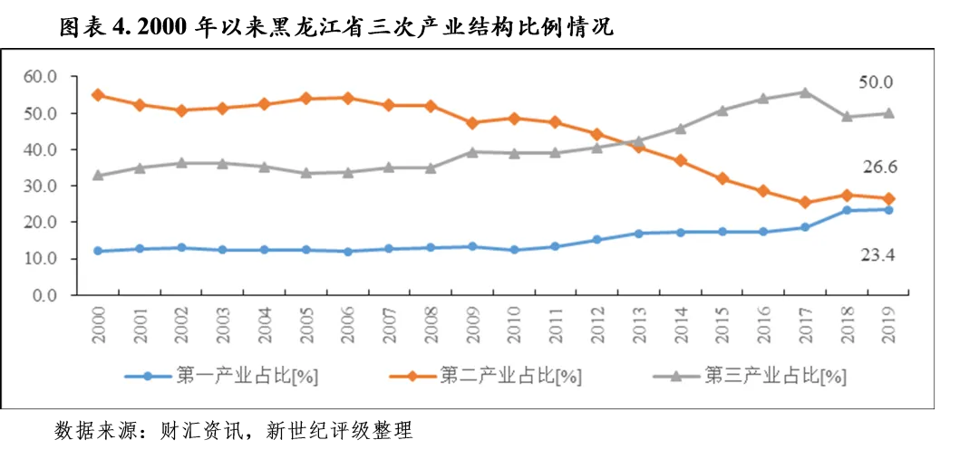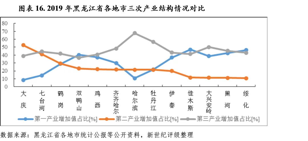 农业在黑龙江省经济结构中占据了重要地位,2019年黑龙江省各地市中7个城市的第一产业占比超过35%,其中佳木斯、绥化、黑河和双鸭山市第一产业比重在40%以上,农、林业系地市经济的重要支柱。由于全省工业体系具有明显重化工和资源依赖型特征,近年来受去产能、调结构和环保政策收紧等影响,工业经济持续承压,第二产业对传统工业城市经济增长的贡献长期处于下行通道,相应地,地区经济结构中第二产业增加值占比持续下滑。作为省内第一大工业城市,2019年大庆第二产业占比较2018年下降为1.3个百分点至52.6%,但仍为全省第二产业规模和占比最高的地市,除七台河达到41.3%以外,其余地市第二产业占比均已降至30%以下。而第三产业方面,2019年哈尔滨市以67.7%的第三产业增加值占比位居第一,其次为牡丹江市和大兴安岭,占比分别为56.9%和50.0%,其余省内各地市第三产业占比均在35%-50%的区间内,总体看随着工业增长承压,第一、三产业已成为地市经济的主要构成。
