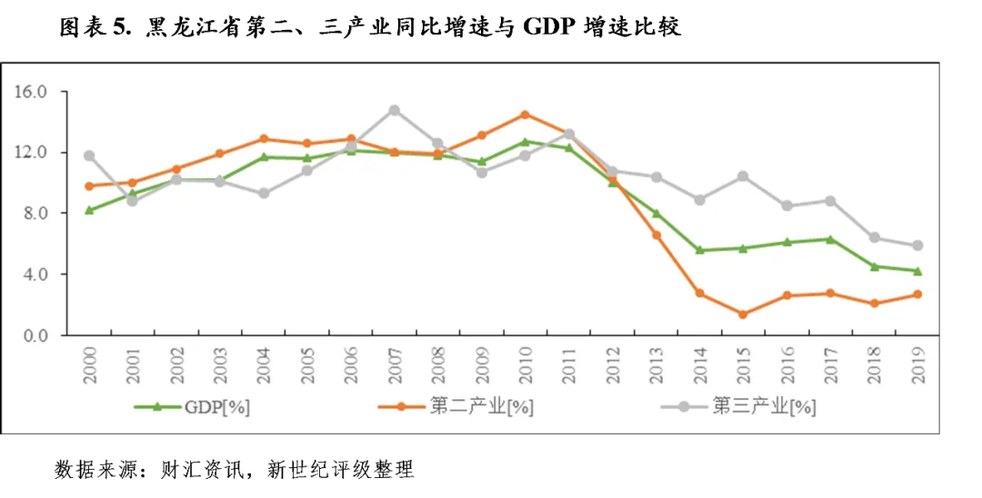 工业方面,依托自然资源禀赋以及计划经济时期国家集中投资等地缘政治历史原因,黑龙江省形成了以能源、装备、石化、食品四大产业为主导的工业体系,长期以来第二产业是拉动地区经济增长的主要推力。但随着我国进入经济结构深度调整期,钢铁、石油石化、煤炭等传统行业产能过剩,以资源型和重工业为主的黑龙江省工业经济承压,工业增速显著低于GDP增速且对经济的贡献度亦持续下降。2019年,第二产业增加值3615.2亿元,同比增长2.7%,低于全国平均水平3.0个百分点;其中,规模以上工业增加值比上年增长2.8%,若扣除石油和天然气开采行业,全省规上工业增加值增长可达6.2%。从行业看,2019年全省装备工业和食品工业同比分别增长11.0%和8.7%,是全省工业经济增长的重要支持。近年来,受工业经济增长乏力影响,服务业逐步成为黑龙江省经济发展的主要动力。2019年,全省第三产业增加值6815.0亿元,同比增长5.9%,增速较上年下降0.5个百分点,低于全国平均水平1.0个百分点,占GDP的比重达50%,对经济增长的贡献率达66.2%,已成为区域经济增长的首要拉动力。