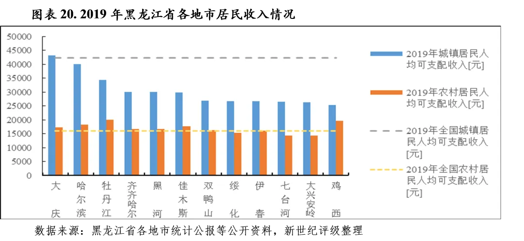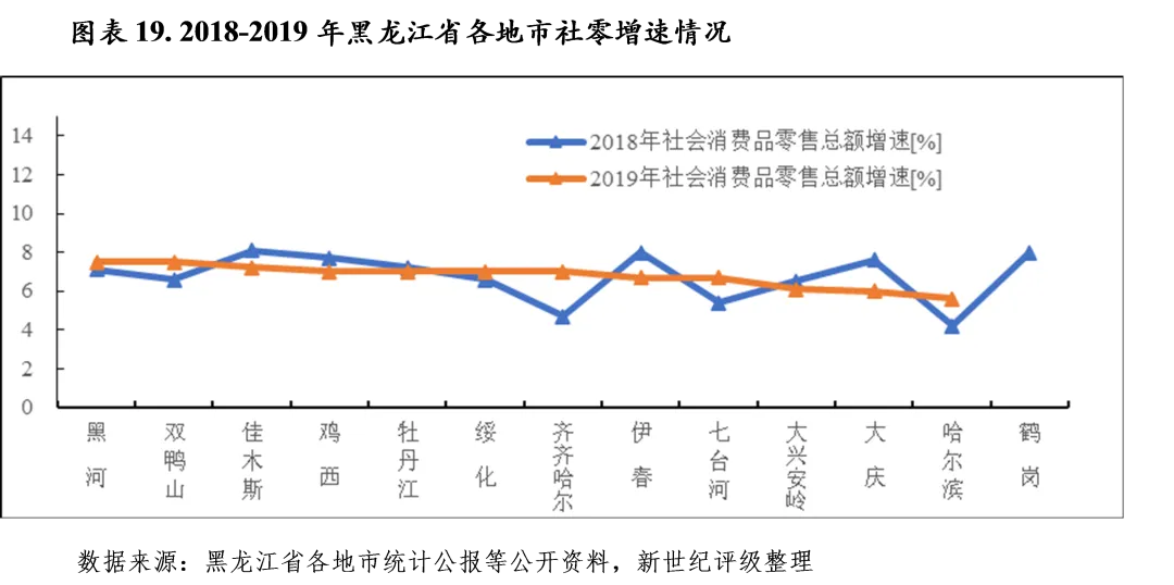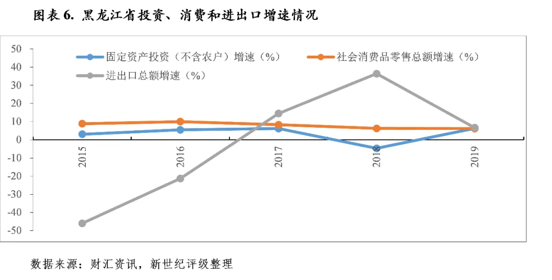 从需求端看,近年来黑龙江省对俄原油进口额逐年攀升,对外贸易逆差持续走阔,对经济发展一直处于负向拉动,投资和消费系全省经济增长的主要动力。2019年,黑龙江省固定资产投资同比增长6.3%,增速较上年提高11.0个百分点,其中基础设施和工业投资同比分别增长22.6%和8.5%,基础设施投资的回暖有效推动了全省投资增长。此外,2019年全省房地产开发投资完成958.0亿元,同比增长仅1.4%,房地产销售市场景气度持续下滑,当期住宅销售面积同比下降12.3%。短期内黑龙江省仍将处于去产能、调结构的经济转型期,固定资产投资仍将是黑龙江省稳增长的重要手段。消费方面,2019年全省社会消费品零售总额同比增长6.2%,增速较上年下降0.1个百分点,目前消费已成为转型调整期内全省经济发展的重要推力。但从人均可支配收入看,2019年全省城镇、农村常住居民人均可支配收入分别为3.09万元和1.50万元,同比分别增长6.0%和8.5%,均低于全国平均水平(4.24万元和1.60万元),居民收入水平的相对滞后,加之人口流出和老龄化的加剧,或将成为制约区域消费潜力释放的重要因素。对外贸易方面,2019年黑龙江省完成进出口总额1865.9亿元,同比增长6.7%,其中进口总额1516.5亿元,同比增长4.2%,主要受进口原油均价下降影响,当期原油进口额同比增长仅1.7%。