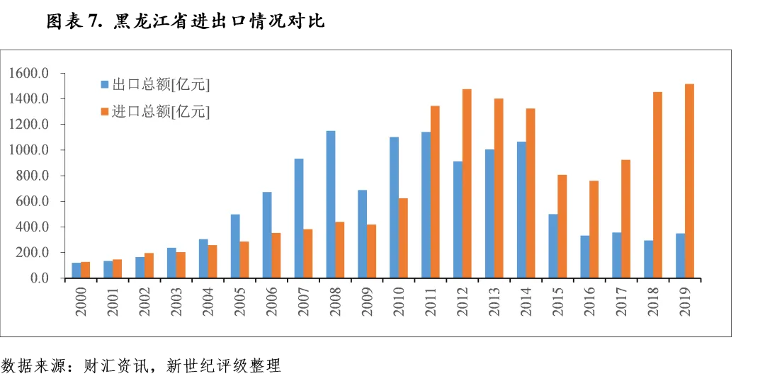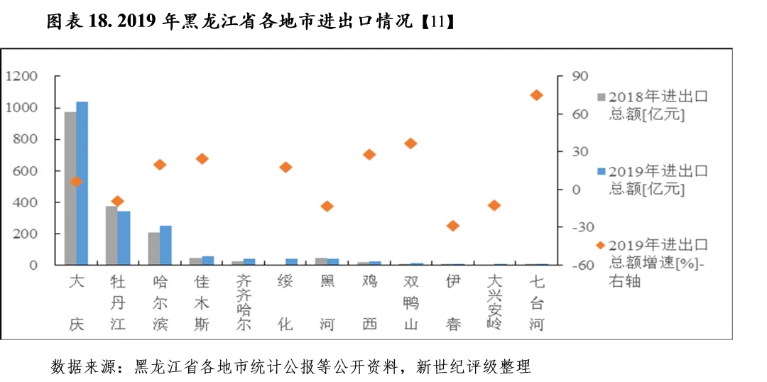 外贸方面,从对外贸易体量看,大庆、哈尔滨、牡丹江在全省各地市处于前三位,其余地市年进出口总额均低于60亿元。2019年,大庆、牡丹江和哈尔滨三市占全省进出口总额的比重分别为55.6%、18.3%和13.5%,均以进口为主。其中2019年大庆市进口总值995.6亿元,占全省进口额的比重超过60%,同比增长6.4%,主要系对俄原油进口;同年,牡丹江市进出口总额同比下降9.4%,主要系进口原材料木材、原油进口总值分别下降9.4%和25.4%所致;同年,哈尔滨市进出口总额为251.5亿元,同比增长19.9%,其中进口总额131.7亿元,同比增长24.0%,出口总额119.8亿元,同比增长15.7%,系黑龙江省主要的商品出口源地。总体看,由于受国际贸易环境趋紧、出口比较优势不足以及持续的原油进口等因素影响,黑龙江省对外贸易活动仍将集中在少部分地市,且随着原油进口量的提高,贸易逆差或将扩大。