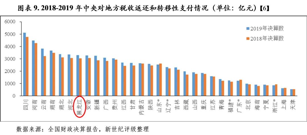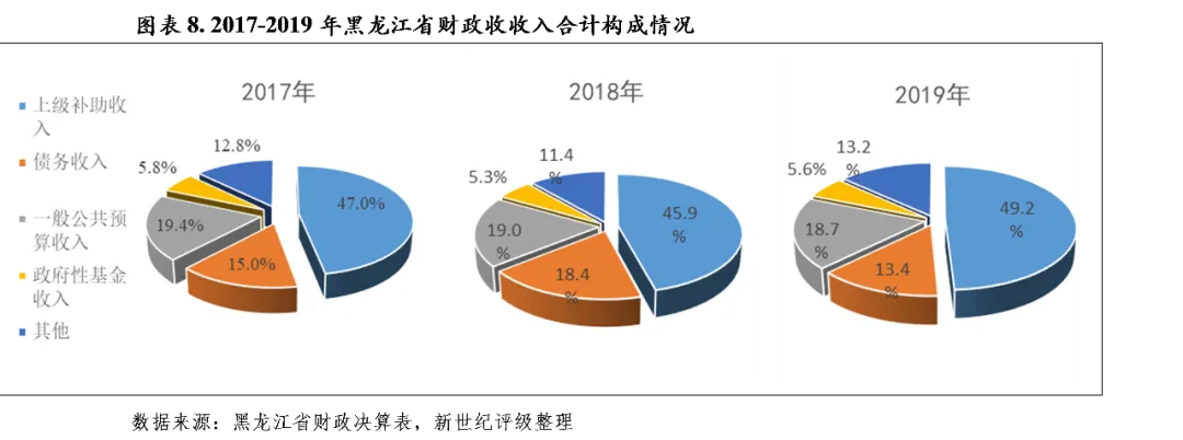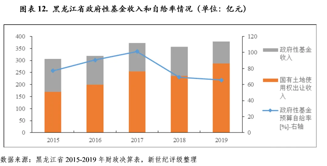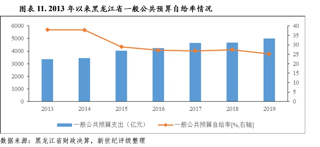 黑龙江省财政实力在全国各省市中相对偏弱,2019年主要受减税降费政策影响,全省一般公共预算收入出现下滑,但民生保障领域的刚性支出有增无减,全省财政收支缺口对上级补助和政府债务的依赖进一步加重。政府性基金收入对黑龙江省财力贡献较小,但近年来随着专项债券额度的下达,政府性基金支出逐年攀升,政府性基金预算自给率大幅下降。得益于中央振兴东北战略的深入实施以及推进全国均衡性发展下,黑龙江省可持续获得较大规模的中央转移支付,能够对地方财力形成稳定支撑。