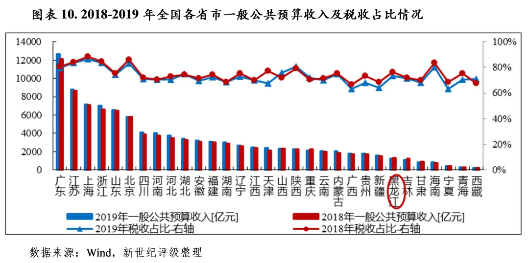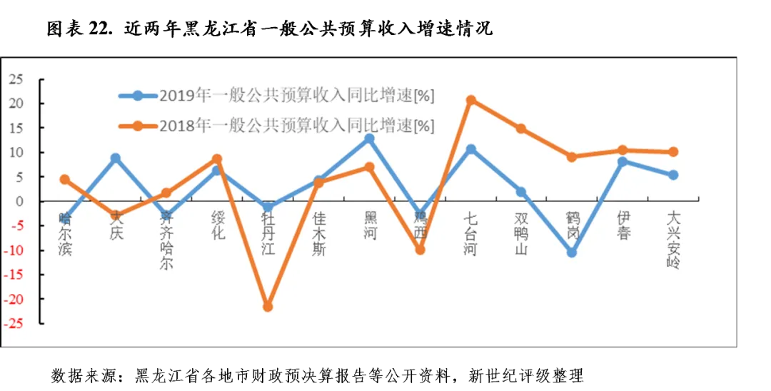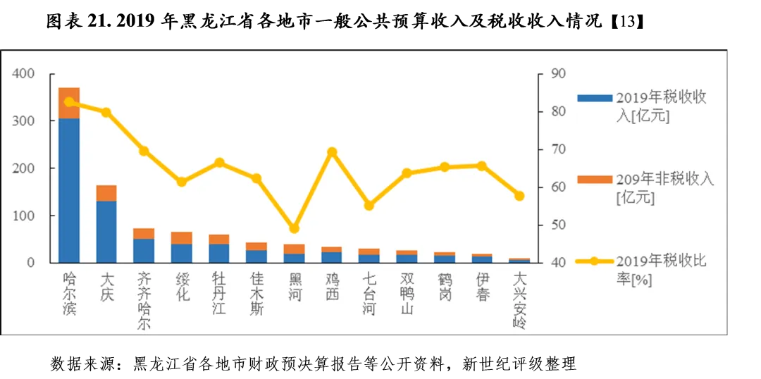 从一般公共预算收入构成看,2019年哈尔滨税收比率为82.5%,一般公共预算收入质量较好,除黑河市税收比率为49.0%外,其余地市均在55%-70%之间;随着减税降费政策的推行,2019年全省9个地市税收收入出现不同程度的下滑,其中鹤岗、七台河和牡丹江市税收收入同比下降10.5%、10.2%和19.2%,受此影响税收比率较2018年有所下降。