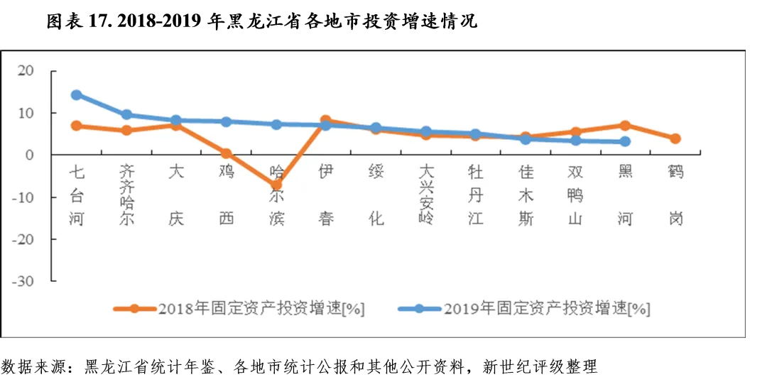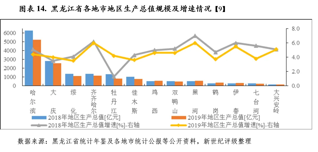 2019年黑龙江省各地市经济格局进一步分化,哈尔滨市作为黑龙江省会,其经济首位度依然显著;大庆市是黑龙江省第二大城市、第一大工业城市,近年来经济增速低位运行,但随着固定资产投资的企稳回升,GDP增速稳步提高。第四次经济普查修订后,省内各地市经济进一步分化,除哈、大二市外,齐齐哈尔和绥化是黑龙江省唯二GDP规模过千亿的城市,牡丹江和佳木斯市降至800亿元上下,与前部地区的差距进一步拉大。其余地市经济体量较小,且鸡西、双鸭山、七台河、伊春等资源型地市,产业结构单一,受资源枯竭、环保等因素影响,经济基础较为薄弱。从GDP增速看,2019年全省13个地市中10个地市出现不同程度下滑,其中七台河降幅达1.8个百分点,其余地市下降0.2-1.0个百分点不等,经济下行压力依然较大。