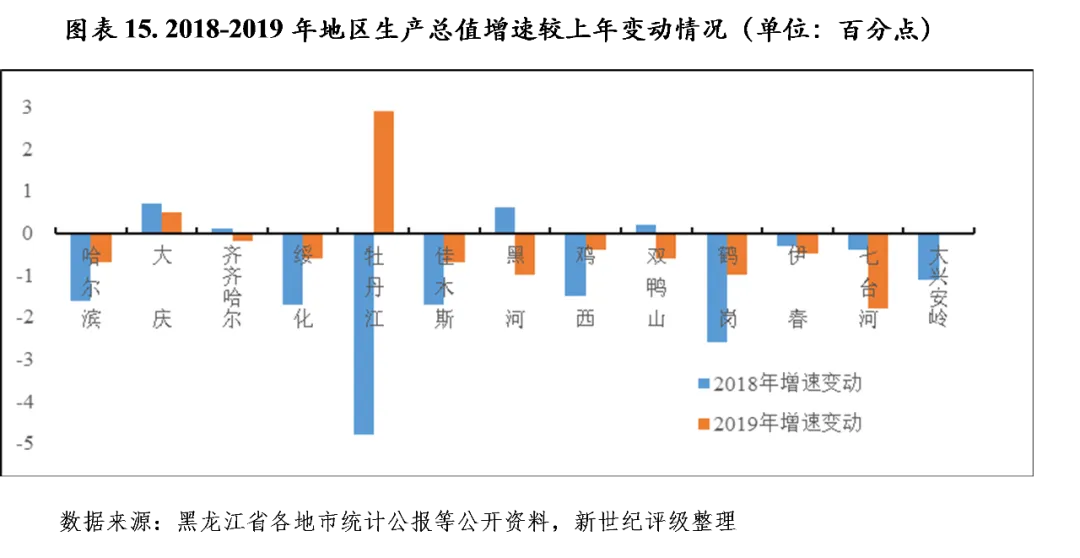 从经济增速看,2019年黑龙江省各地市经济增速仍处于低位,其中齐齐哈尔和黑河两市均为6.0%,并列全省首位,伊春和大兴安岭为5.5%和5.1%外,其余地市经济增速均在5.0%以下,大庆、绥化、佳木斯、鹤岗和七台河等增速低于全省平均水平,其中绥化市以3.5%的增速位居全省末位。从经济增速变动情况看,2019年黑龙江省各地市经济下行压力依然较大,全省13个地市中10个地市出现不同程度下滑,其中七台河降幅达1.8个百分点,其余地市下降0.2-1.0个百分点不等。增速提高的地市分别为牡丹江和大庆,大兴安岭地区增速与上年持平。其中,牡丹江市增速较上年回升2.9个百分点,但主要系此前2018年数据“挤水分”导致的增速基数较低所致;大庆市回升0.5个百分点,地区GDP增速已连续三年回升。