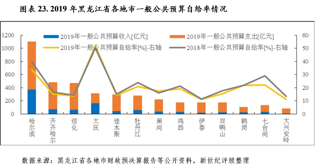 2019年,哈尔滨、齐齐哈尔、牡丹江、鸡西和鹤岗5市一般公共预算收入出现负增长,其余各地市收入均呈增长态势,各地市一般公共预算收入规模与地区经济发展水平序次大致相同。哈尔滨一般公共预算收入规模仍领先于省内其他地市,除此之外仅有大庆收入过百亿,牡绥齐3市超过50亿,其余各市收入规模偏小,大兴安岭仍居于全省末位。从收入质量上看,2019年哈尔滨和大庆税收比率位居前列,除黑河市税收比率低于50%外,其余地市均处于55%~70%的区间,一般公共预算收入质量尚可;但各地市一般公共预算自给能力普遍偏低,除大庆外均在40%以下,对上级补助的依赖程度高。