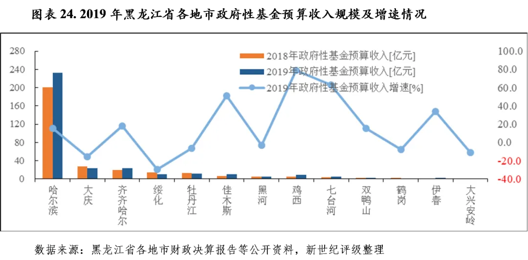 哈尔滨占黑龙江省政府性基金预算收入的比重过半,其余各地市受制于区域房地产市场景气度和投资需求低迷,土地出让规模小且年度间波动较大,整体对全省政府性基金收入的贡献较小,但相对应各地市财力对政府性基金预算收入的依赖程度相对偏低。