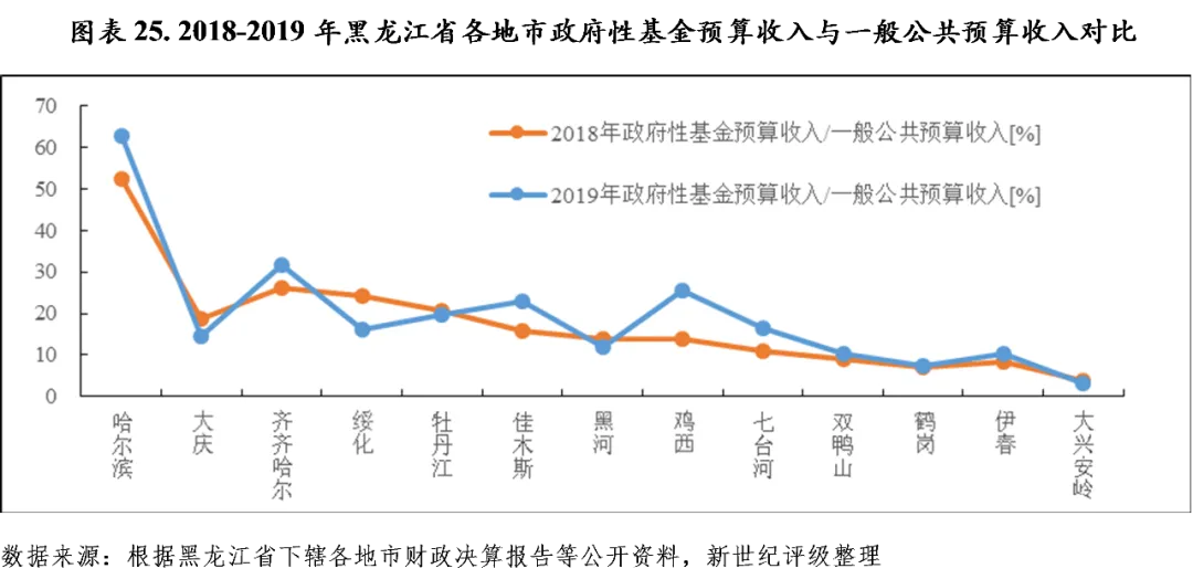 以政府性基金预算收入与一般公共预算收入规模相比,2019年除哈尔滨和齐齐哈尔分别达到62.7%和31.8%外,其余各地市政府性基金预算收入对一般公共预算收入的比率区间均在30%以下。由于区域土地市场景气度低迷,除哈尔滨外,黑龙江省内各地市政府性基金预算收入普遍较为薄弱,但相对应各地市地方财力对政府性基金预算收入的依赖程度相对偏低。