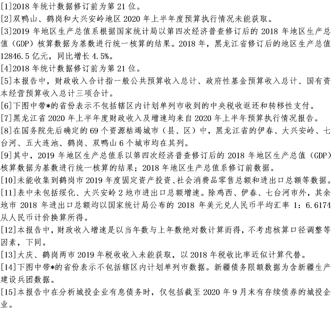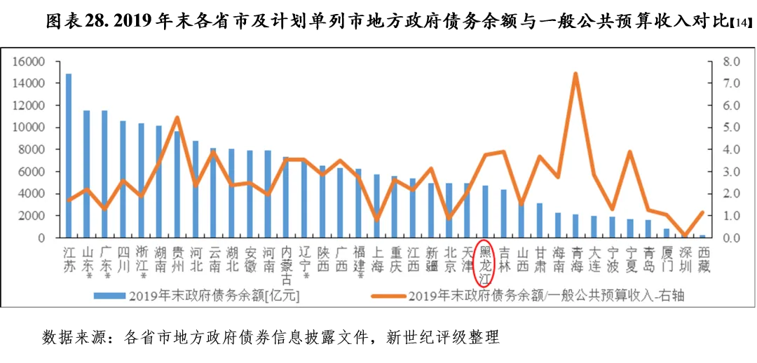 从黑龙江省城投平台带息债务情况来看[15],黑龙江省全省城投企业2019年末带息债务合计为1923.1亿元,在全国31个省市规模降序排列中排名第26位,黑龙江省城投企业2019年末带息债务是当年全省一般公共预算收入的1.5倍,该指标在全国处于中下游水平,位列31个省市降序排列第24位。