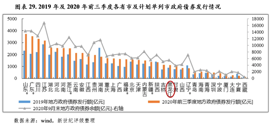 2020年,财政部核定黑龙江省新增地方政府债务限额1061亿元,其中新增一般债务限额479亿元、新增专项债务限额582亿元。2020年前三季度,黑龙江省地方政府债券发行达1105亿元,位列各省市第24位,其中新增债券发行928亿元、再融资债券发行176亿元,尚有133亿元新增债务额度尚未使用。截至2020年9月末,黑龙江省存续期内政府债券余额5571亿元,位于各省市第24位。总体看,近年来黑龙江省债务规模持续扩大,但财政收入增长较为乏力,同时民生保障领域等刚性支出有增无减,加之2020年以来债券发行进度加快,地方政府债务负担进一步加大。