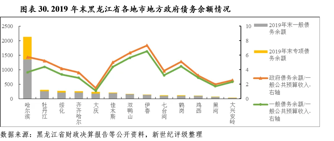哈尔滨政府债务余额在黑龙江省内各地市中规模最大,占全省债务规模的比重接近一半;2019年全省主要地市的债务规模出现大幅增长,其中8个地市债务余额较2018年末增长超过20%,受此影响各地市债务偿付压力进一步加重。2019年末,各地市政府债务余额与当年一般公共预算收入比值的中位数由2018年末的3.2倍提高到4.2倍,其中债务余额超过一般公共预算收入5倍以上的地市有6个,为哈尔滨、牡丹江、佳木斯、双鸭山、伊春和鹤岗6市,伊春市已高达7.4倍,而2018年仅有3个;全省债务压力最轻的为大庆市,比值仅为1.5倍。