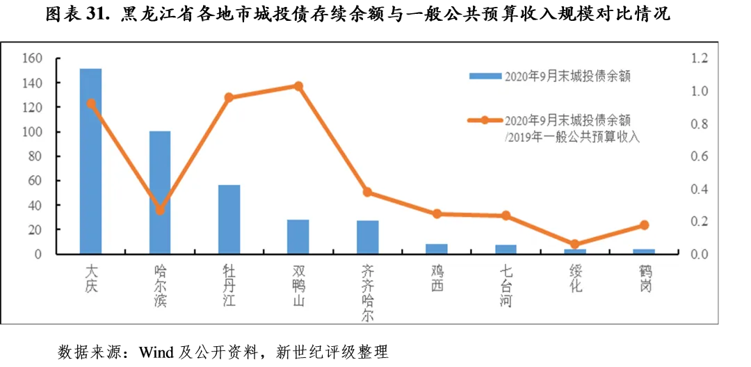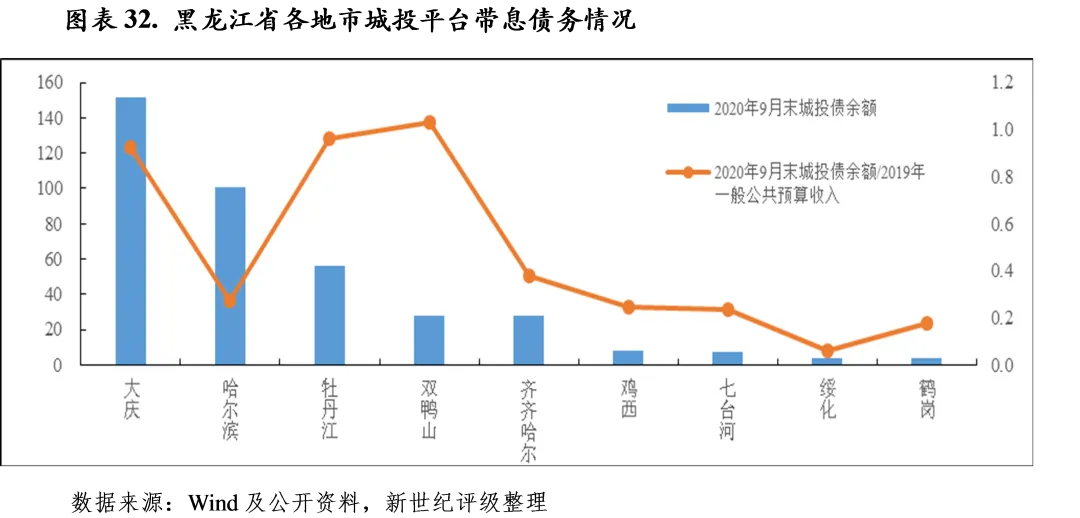 黑龙江省城投平台债券余额在全国各省中相对较小,截至2020年9月末,伊春、佳木斯、大兴安岭、黑河4市无存续城投债。从偿债压力看,双鸭山、牡丹江、七台河城投债存在一定偿付压力,其余各地市城投债偿付压力较轻。由于哈尔滨和大庆以外地市的财力普遍偏弱,除鹤岗、绥化外,其余各地市城投企业有息债务负担相对较重,特别是双鸭山、鸡西和齐齐哈尔4市,2019年末城投带息债务余额与当年一般公共预算收入的比重已在4.0倍上下。