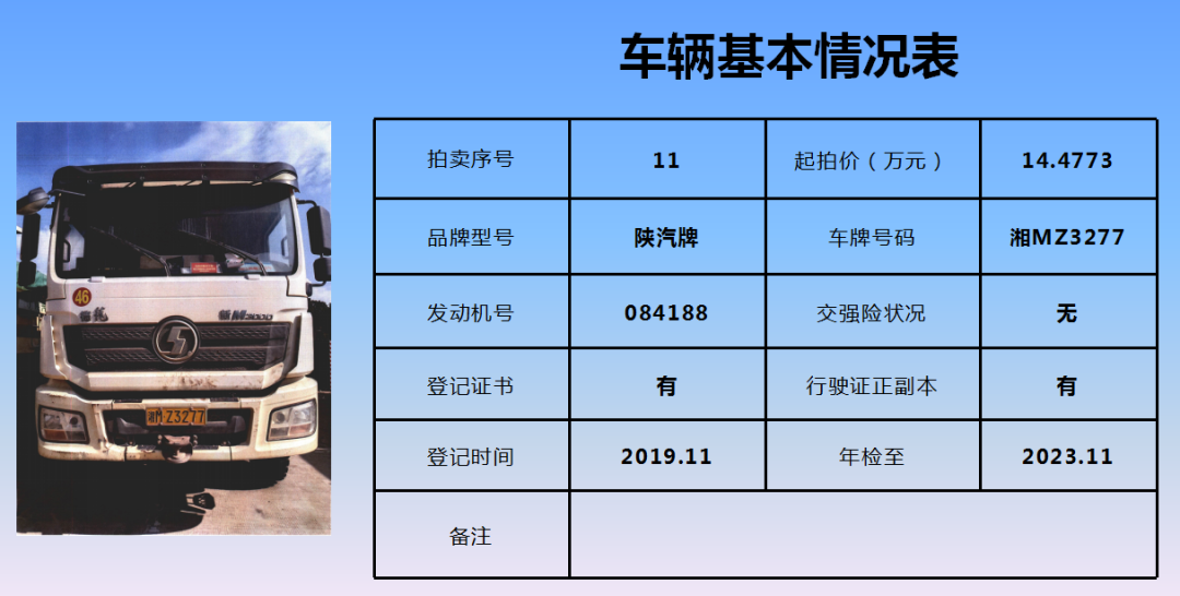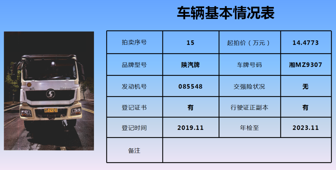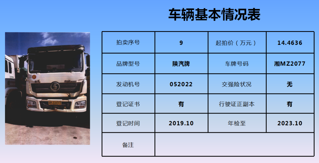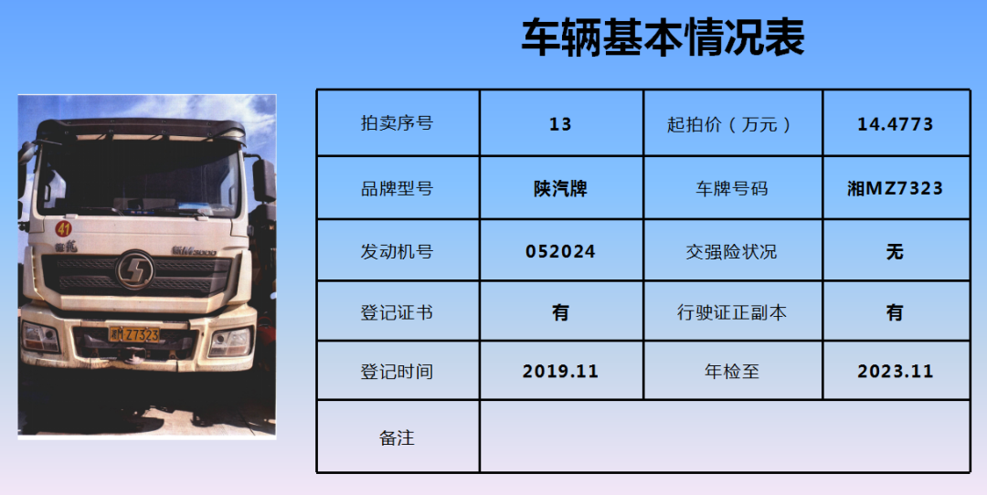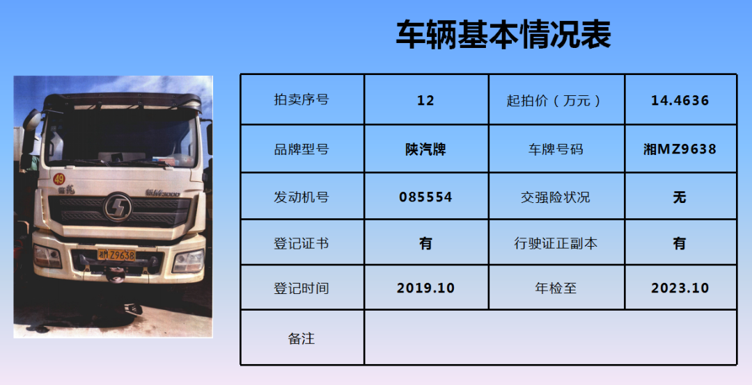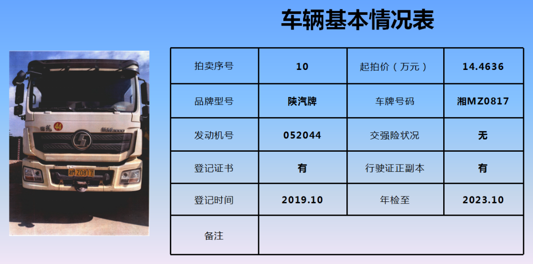 1.标的名称:永州市城发工程机械经营有限公司12辆陕汽牌渣土车、3辆中联牌水炮车,起拍价:4.5777万元-42.8446万元,竞买保证金2万元-5万元/辆。