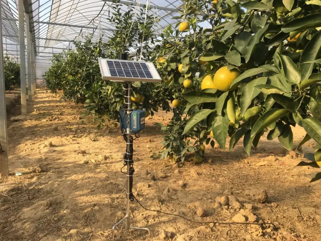 一棵棵鸡尾葡萄柚子树旁边,矗立着土壤传感器、光传感器等设备,这些数据被传到果园旁边的数字化控制室里,两台显示屏,实时监控着土壤水分、PH值、日照时数、光和有效辐射等情况。根据这些数据,果农可以在电脑或手机上远程实时操控灌溉的时间、强度等等,避免造成旱、涝,也避免浪费资源。