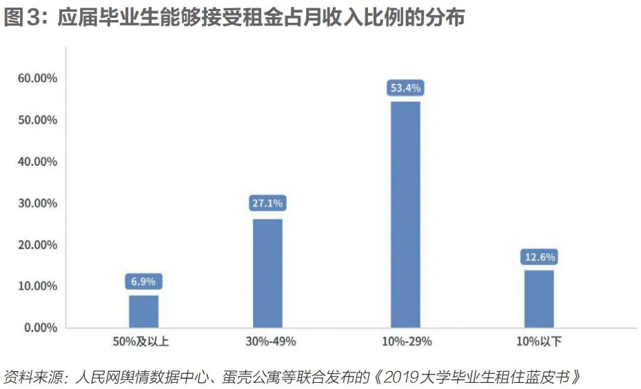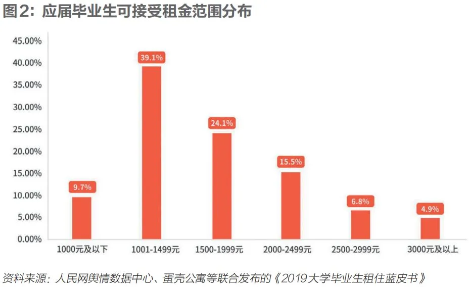 2019年9月,人民网舆情数据中心与蛋壳公寓等联合发布了国内首部《大学毕业生租住蓝皮书》(简称《蓝皮书》)。《蓝皮书》中对全国多省市高校聚集地的应届大学毕业生进行了抽样调查,调查显示,大专到硕士学历的毕业生选择租房的占比都在95%以上,租房需求和意愿都非常明显。