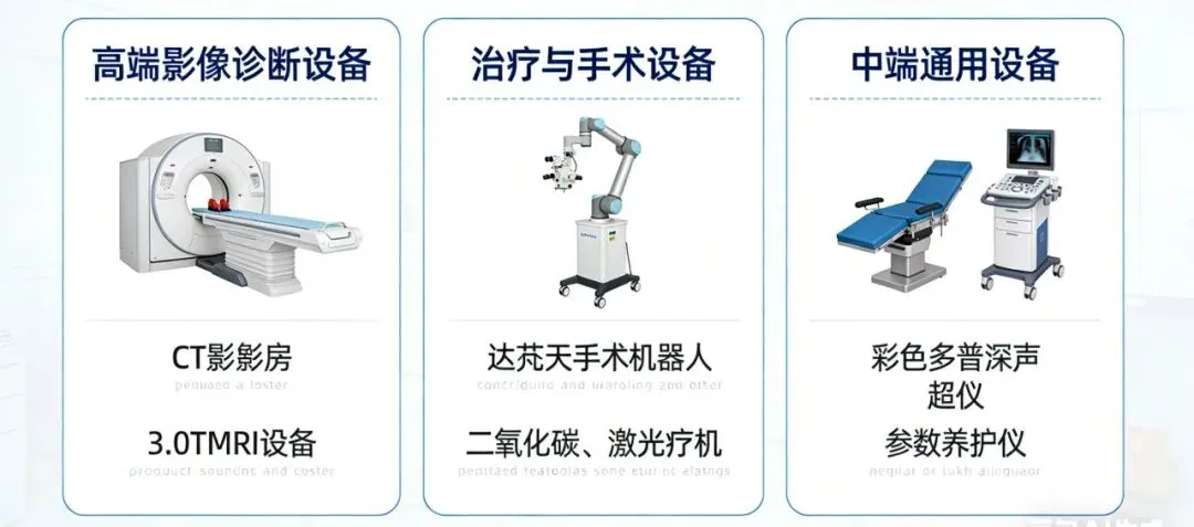 2、治疗与手术设备:直线加速器(放疗)、大型手术机器人(如达芬奇)、骨科手术导航系统、高清内窥镜系统等。