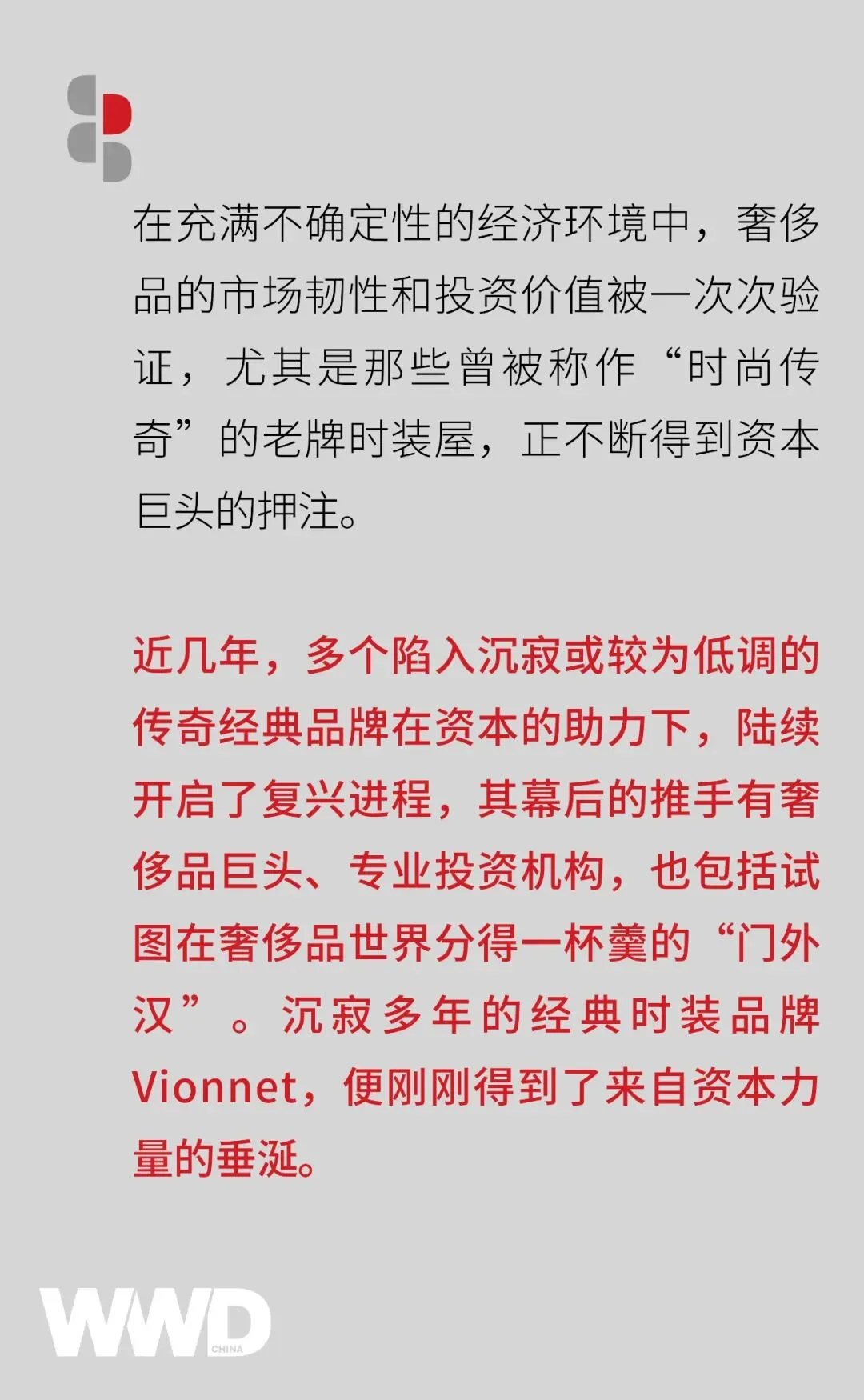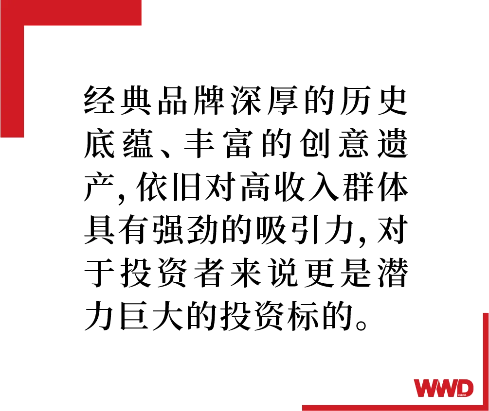 不论如何,从目前来看,重启、复兴一个传奇经典品牌的难度和复杂性,显然并没有浇灭资本的热情 -- 深厚的历史底蕴、丰富的创意遗产,在当下奢侈品世界中依旧对高收入群体具有强劲的吸引力,对于投资者来说更是潜力巨大的投资标的。