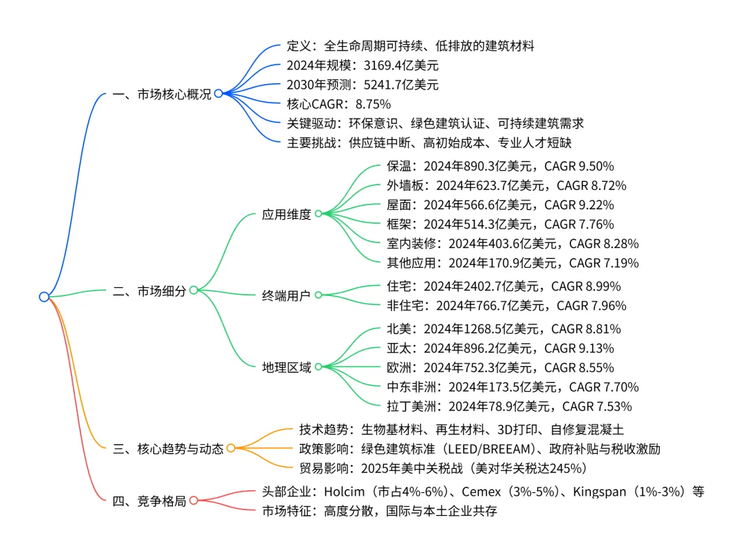 全球绿色建筑材料市场在 2024年规模达3169.4亿美元,预计 2030 年将增至5241.7亿美元,年复合增长率(CAGR)为8.75% ,受环保意识提升、严格建筑标准(如 LEED、BREEAM 认证)及可持续建筑需求驱动;市场按应用分为保温、外墙板、屋面等领域(其中保温segment 增长最快,CAGR 9.50%),按终端用户涵盖住宅(2024年占比75.81%)与非住宅领域,地理上北美为最大市场(2024 年规模 1268.5 亿美元)、亚太为最快增长区域(CAGR 9.13%);核心趋势包括生物基材料、再生材料应用及技术创新,但面临供应链中断、初始成本高、专业人才短缺等挑战,同时 2025 年美中关税战对原材料成本及供应链产生一定影响。