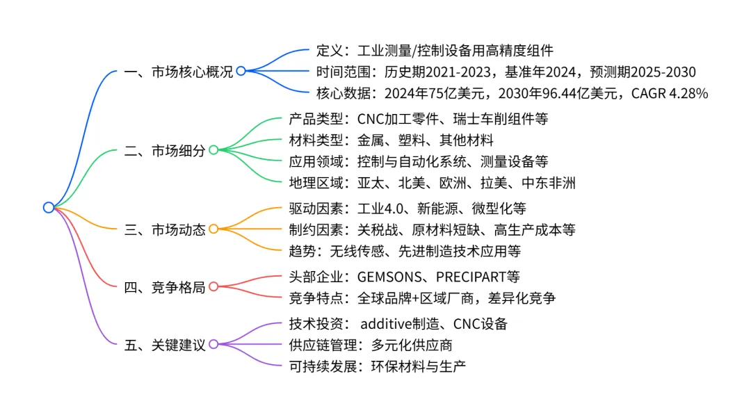 2024-2030 年全球仪器精密零件市场规模 2024 年达 75 亿美元,预计 2030 年增至 96.44 亿美元,CAGR 为 4.28%;市场以CNC 加工零件(2024 年占比 35.08%)和金属材料(2024 年占比 66.57%)为主导,控制与自动化系统是最大应用领域(2024 年占比 42.30%);亚太地区是最大且增长最快的区域市场(2024 年占比 35.37%,CAGR 5.34%),受工业 4.0、新能源等驱动;市场受关税战、原材料短缺等因素制约,但受益于自动化普及、微型化需求等趋势,竞争格局呈现全球品牌与区域厂商差异化竞争态势。