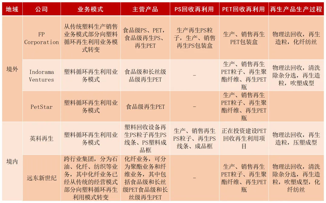 全球塑料回收市场范围广,塑料回收行业竞争格局及产品类别较为分散。境外回收再生公司主要包括日本FP Corporation、泰国Indorama Ventures和墨西哥Pet Star,其大多数从事PET塑料再生、回收、利用业务的公司。境内回收再生公司除英科再生以外,主要是中国台湾的远东新世纪股份有限公司,其涉及范围较广包括制衣、化纤、纺纱、织染、石化等多个业务领域。
