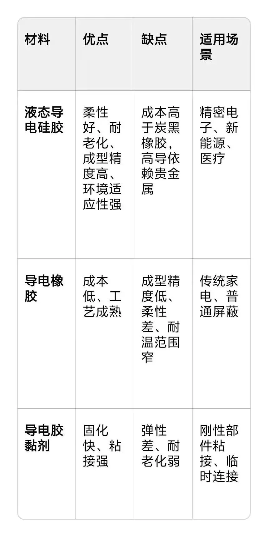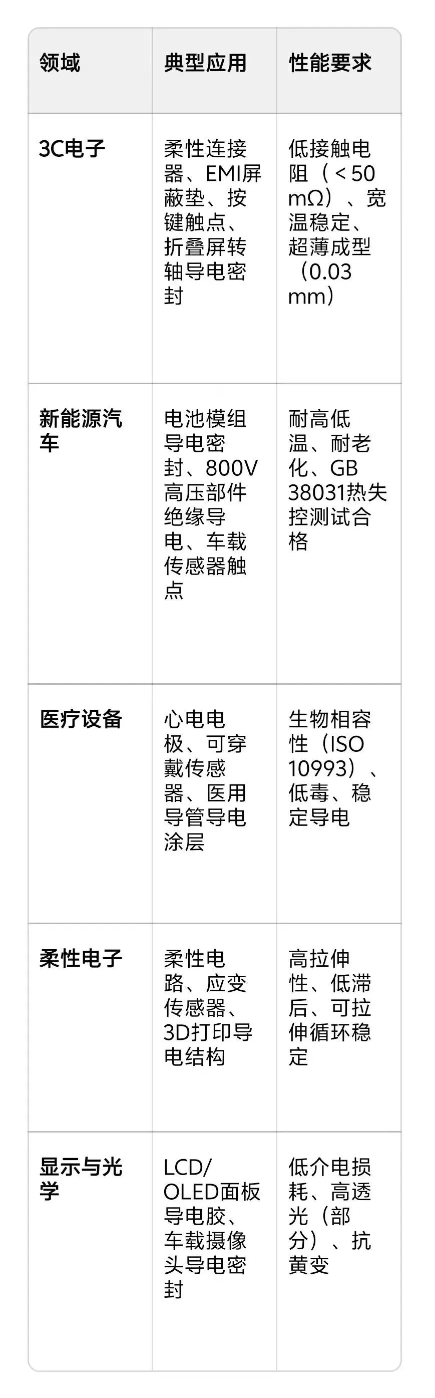 - 应用:电池包导电密封、800V高压触点、热管理界面、电机绝缘导电。