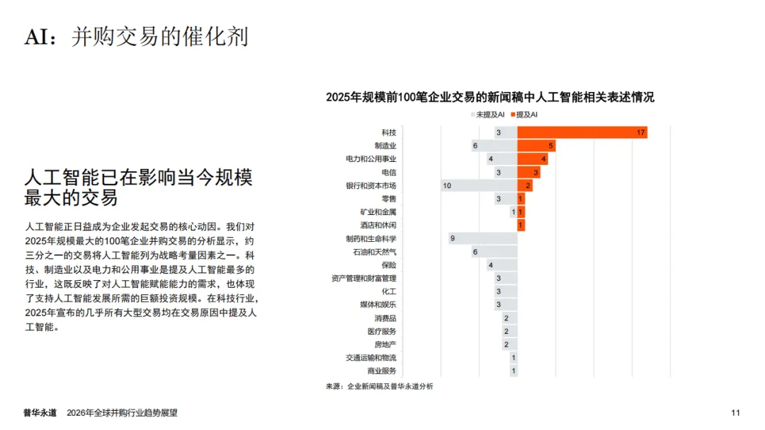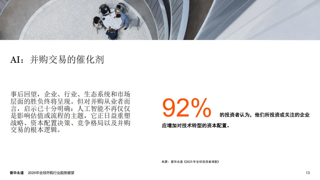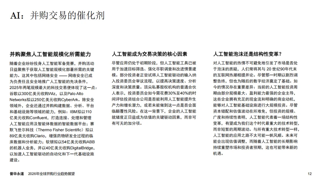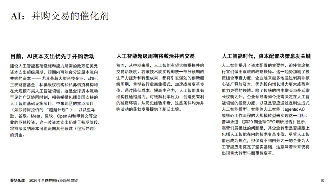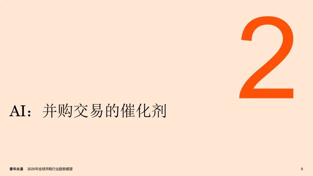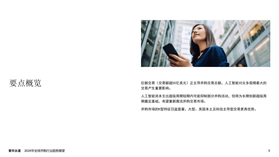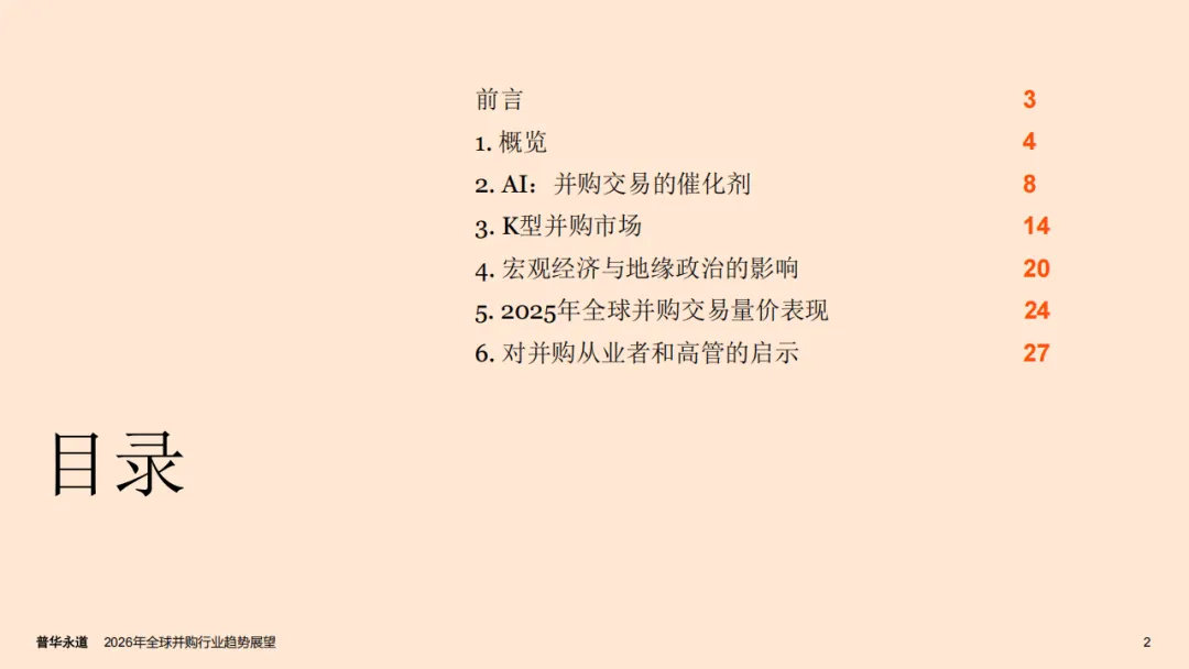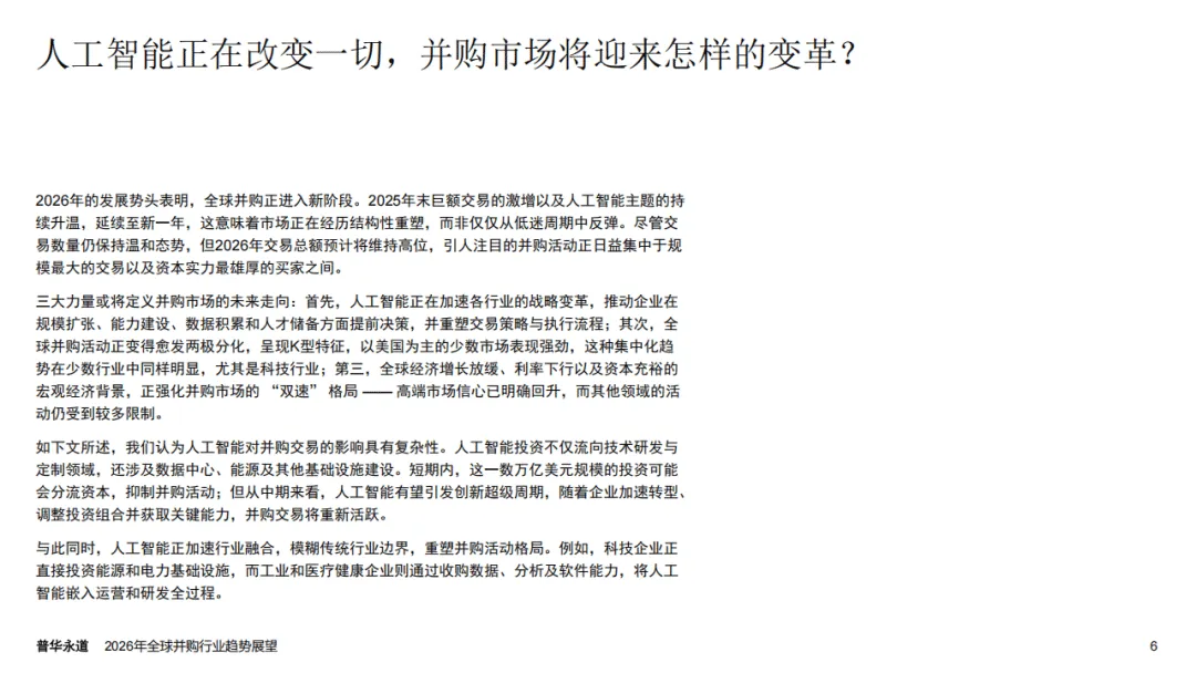 普华永道2026年全球并购行业趋势展望报告指出,全球并购市场正迎来结构性重塑,呈现出由AI驱动、K型分化显著的发展特征,宏观经济与地缘政治因素则从多维度影响市场走向,2025年行业量价表现的背离也印证了这一市场变化趋势。