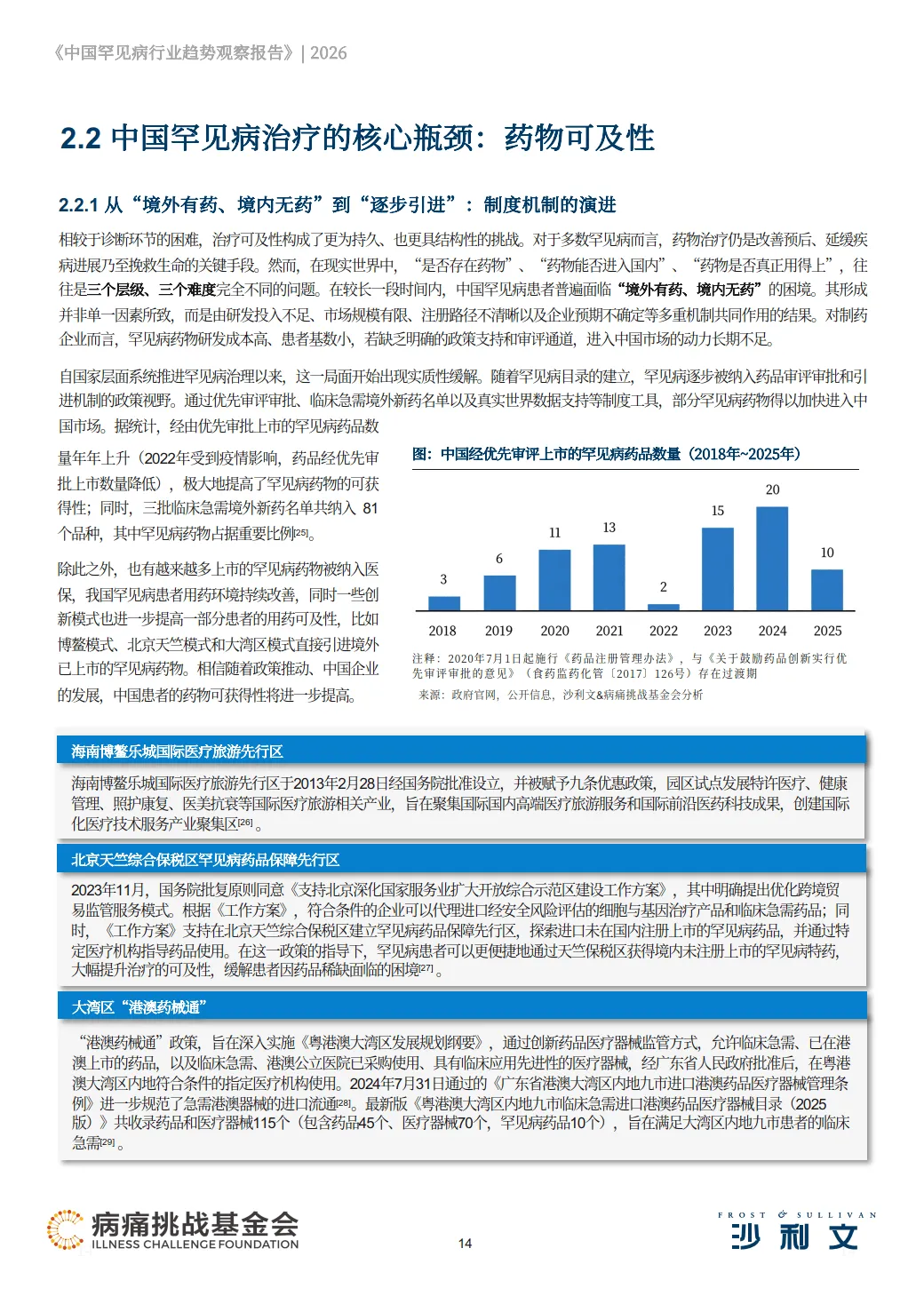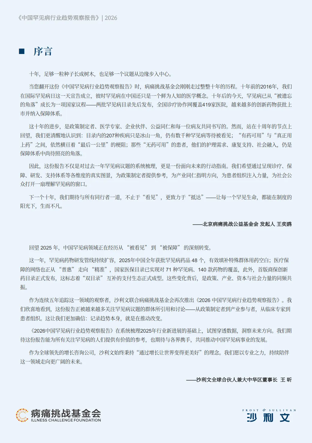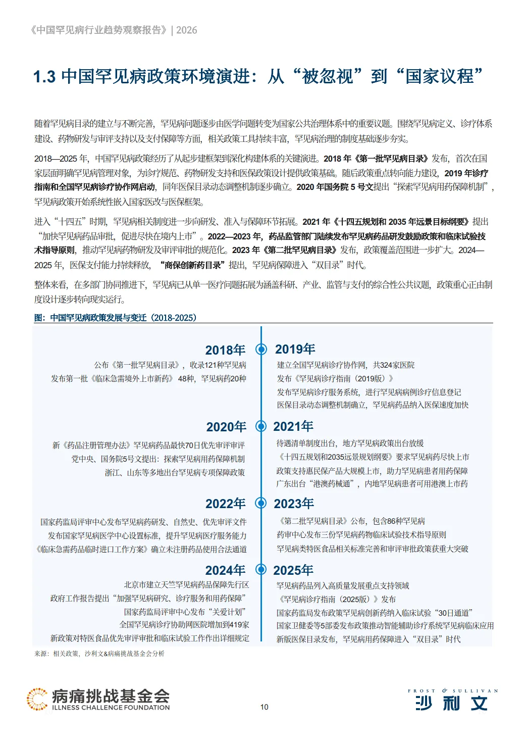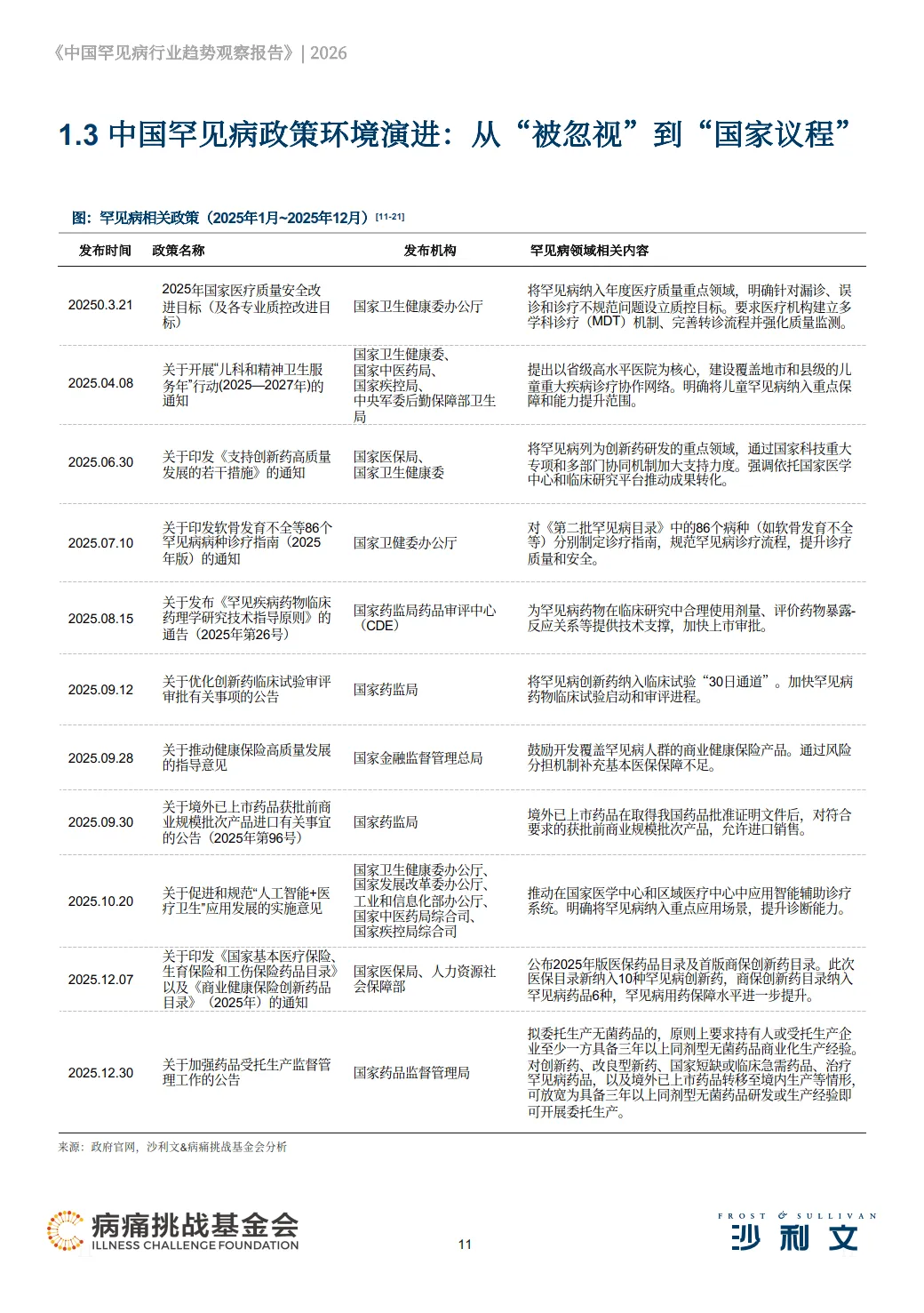 报告指出,全球已知罕见病超 10000 种,中国已知逾 4000 种,患者规模约 2000 万。经过十年发展,中国已发布两批罕见病目录,覆盖 207 种疾病,全国诊疗协作网扩展至 419 家医院,形成了政策、产业、资本与社会力量协同发力的格局。2025 年行业成果显著,全年获批罕见病药品 48 款,其中国内企业研制超 17 款,国家医保目录已覆盖 71 种罕见病的 140 款药物,首版商保创新药目录同步发布,“双目录” 互补的支付生态正式成型。
