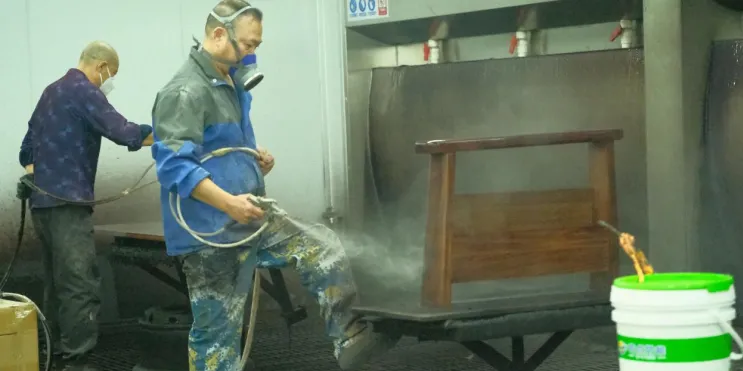 走进福林木业的喷涂车间,工人黄师傅停下手中的喷枪,摘下口罩——准确说,是普通的防尘口罩。