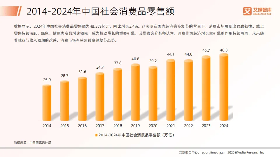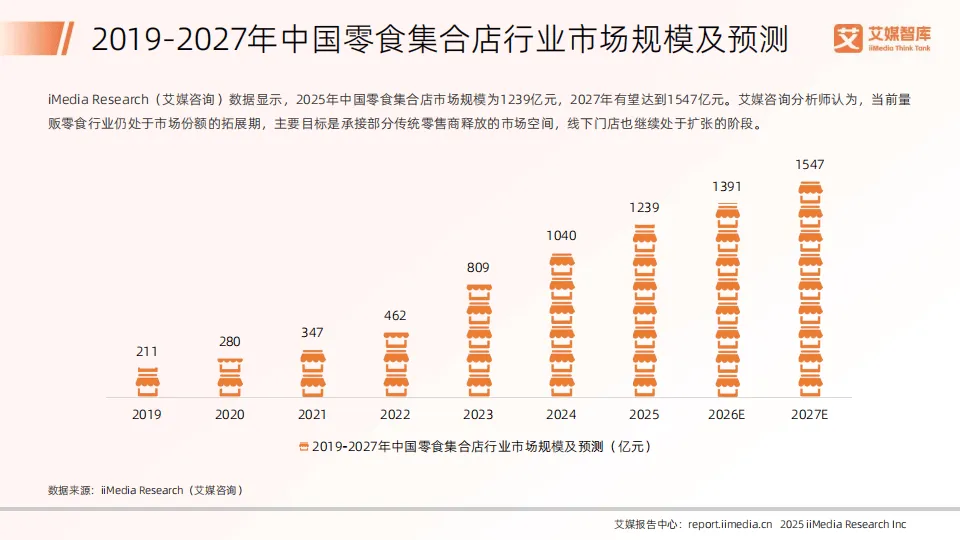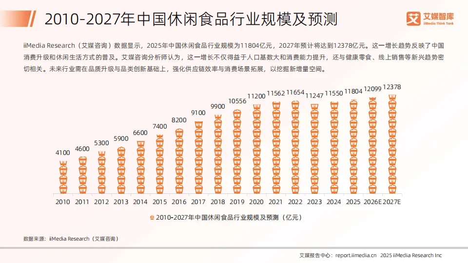 2025年中国休闲食品行业在国内经济稳步复苏的背景下展现出稳健发展态势,艾媒咨询相关调研数据勾勒出行业规模增长、消费行为升级的整体特征。2024年社会消费品零售额达48.3万亿元,为行业发展奠定基础,2025年休闲食品行业规模达11804亿元,2027年预计增至12378亿元,零食集合店赛道同样增长迅猛,2025年市场规模1239亿元,行业整体迎来品质与品类创新的发展新阶段。