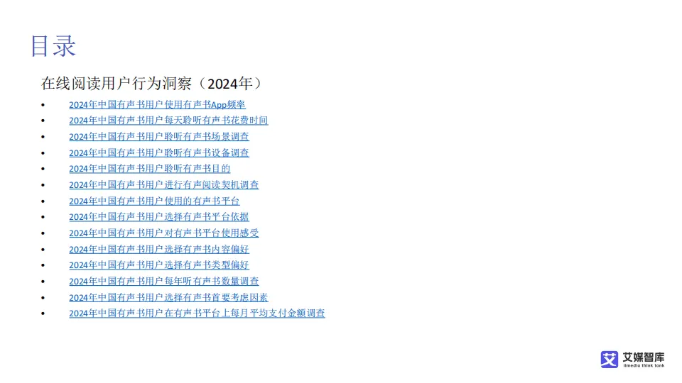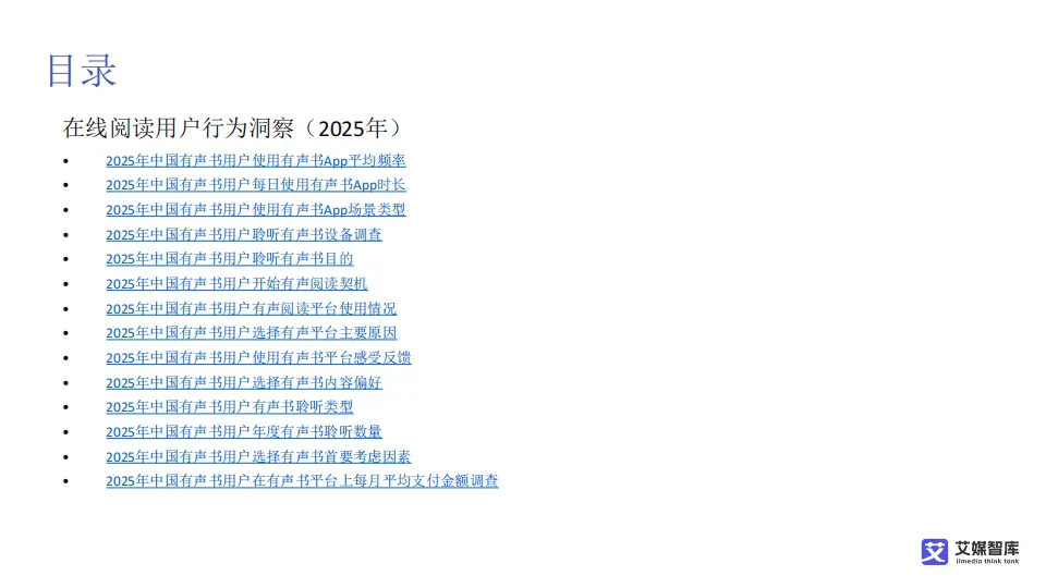 这份报告由艾媒智库发布,聚焦中国在线阅读市场发展及用户消费行为,核心涵盖2016-2019年行业核心规模数据,以及2020、2023-2025年有声书用户行为深度洞察,展现了在线阅读行业从规模扩张到有声书细分领域成熟发展的趋势。