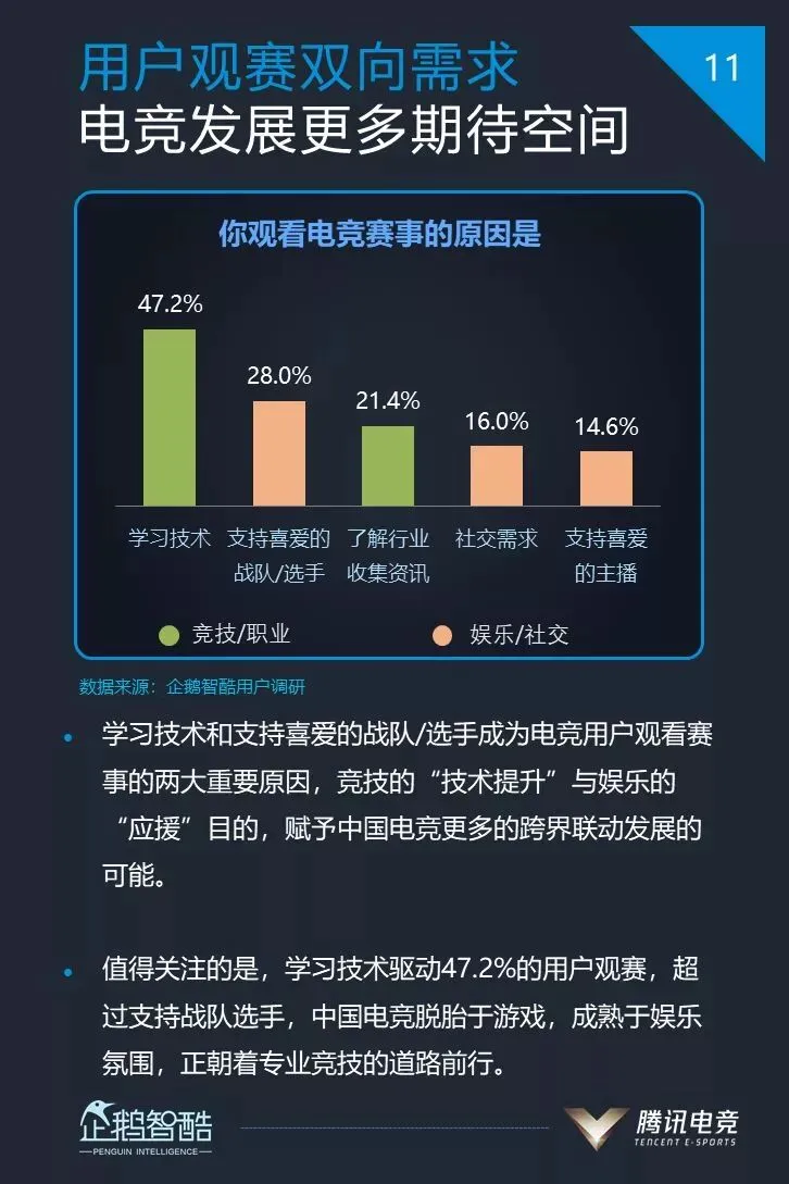 10、47.2%的电竞用户观看电竞赛事的原因是学习技术