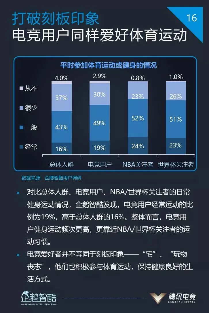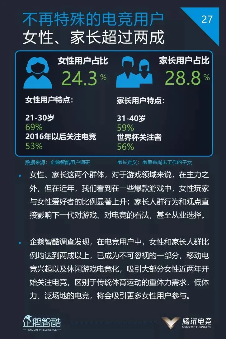 2、电竞用户构成中,女性和家长(家里有尚未工作的子女)用户占比均超过两成
