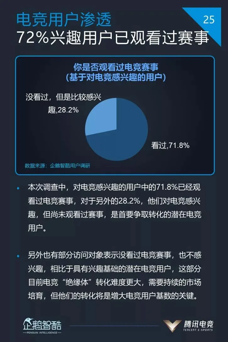 1、对电竞感兴趣的用户中,72%的用户已经观看过电竞赛事