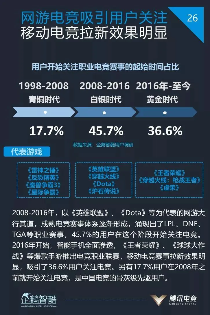 4、36.6%的电竞用户在近两年开始关注电竞,移动电竞赛事拉新效果明显