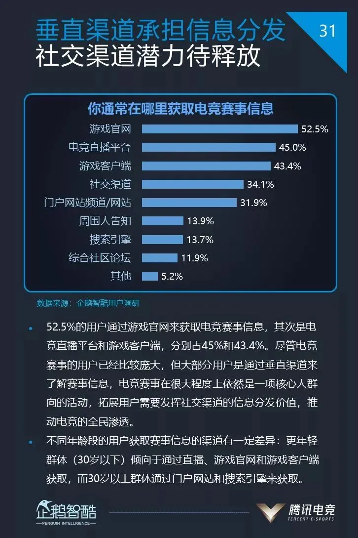 6、52.5%的电竞用户通过游戏官网来获取电竞赛事信息,其次是电竞直播平台和游戏客户端