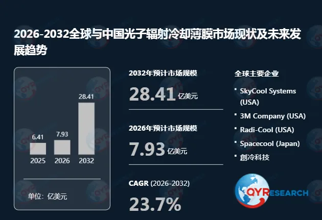 根据QYR(恒州博智)的统计及预测,2025年全球光子辐射冷却薄膜市场销售额达到了6.41亿美元,预计2032年将达到28.41亿美元,年复合增长率(CAGR)为23.7%(2026-2032)。