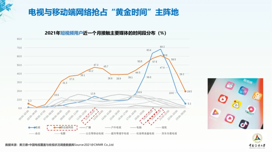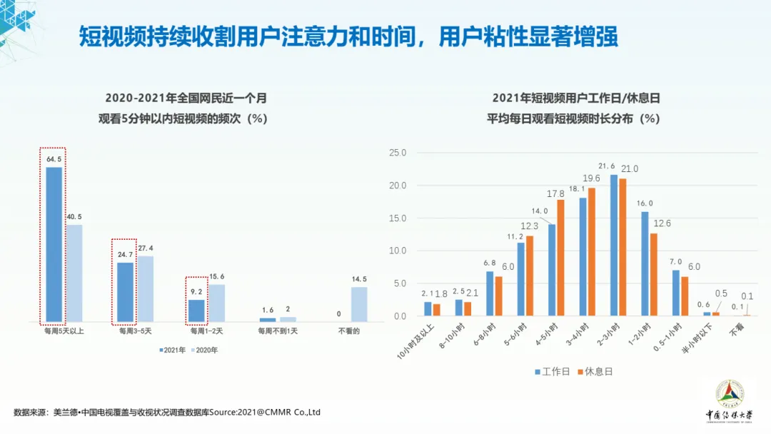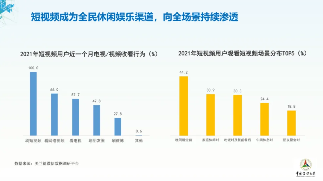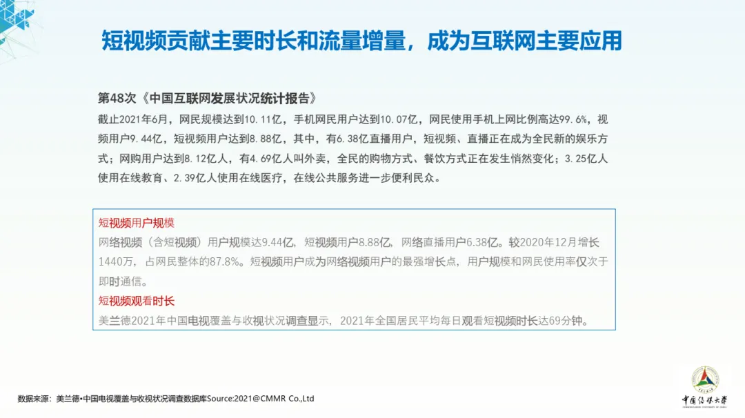 2021年全国居民平均每日观看短视频时长达69分钟。短视频作为基础的用户表达和内容消费形式,在媒介生态中的地位持续攀升,贡献了移动互联网的主要时长和流量增量,成为互联网的基础应用。