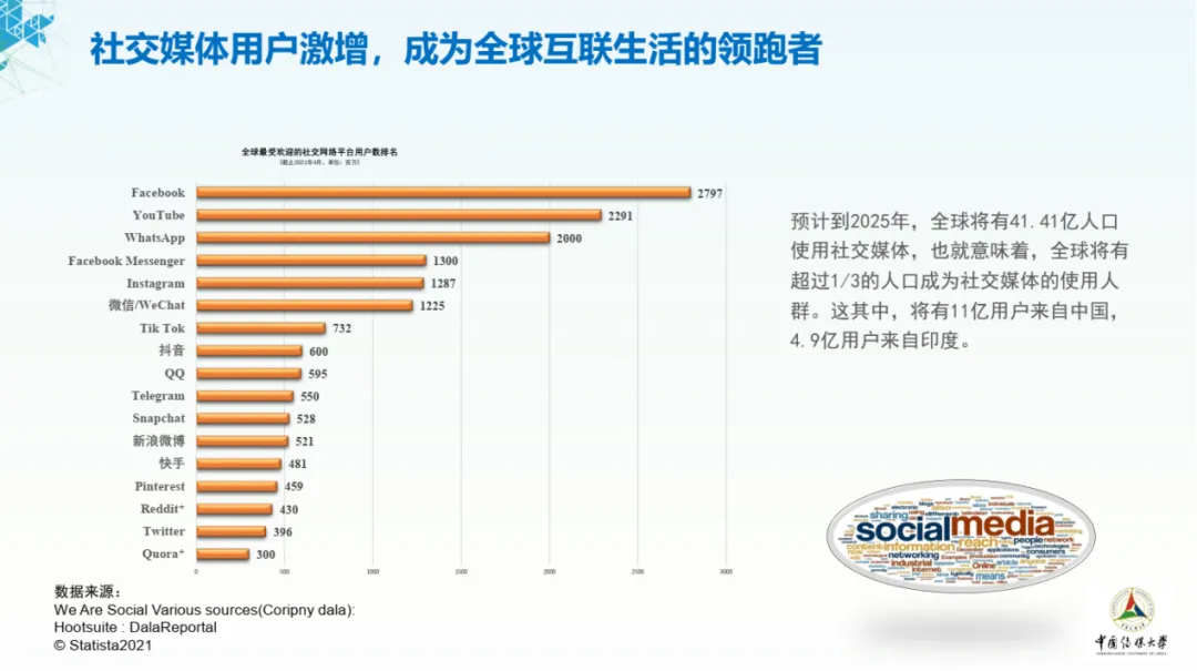 预计到2025年,全球将有41.41亿人口使用社交媒体。也就意味着,全球将有超过1/3的人口成为社交媒体的使用人群,社交媒体用户将成为全球互联生活的领跑者。而这其中,将有11亿用户来自中国。