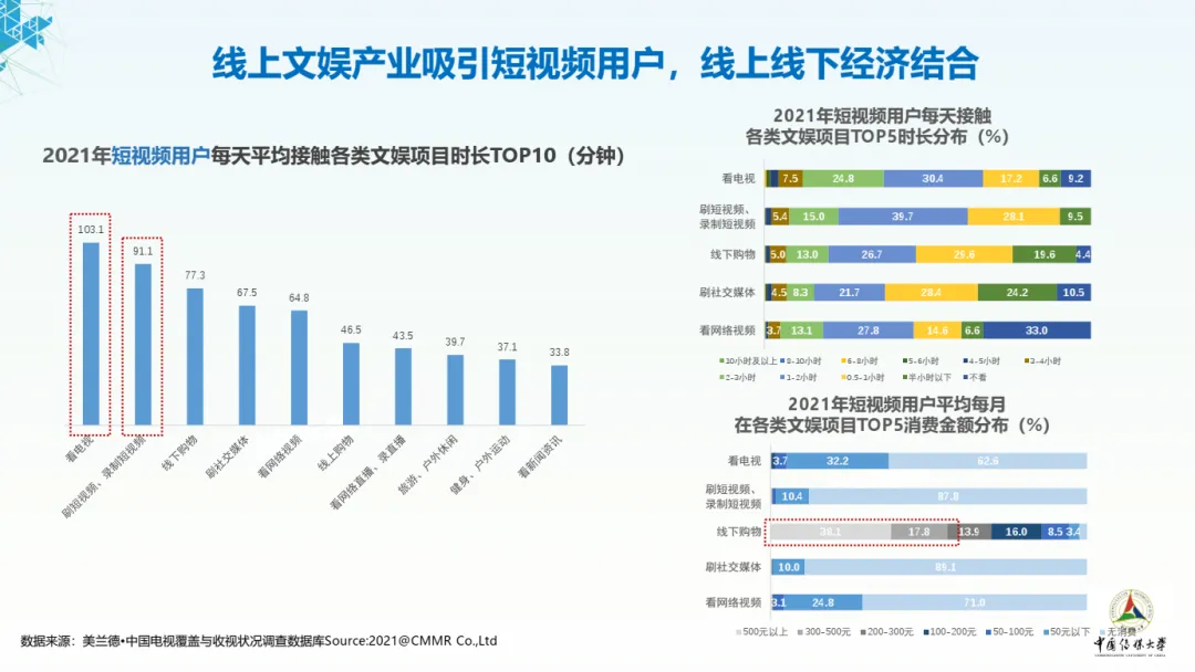 2021年晚间黄金时段受众娱乐「主阵地」再次被电视霸占,移动端网络则占据了19:00-21:00之外时段的受众注意力。而在21:00-22:00时段,移动端媒体以56.5%的接触率重新反超电视媒体,成为该时段接触率第一的媒体类型。总体来看,呈现出电视媒体与移动端网络抢占黄金时段的趋势。在时长分布方面,超三成的短视频用户不看网络视频。电视和短视频争相占据用户注意力,一定程度上挤压了其他线上、线下文娱方式的产业空间。