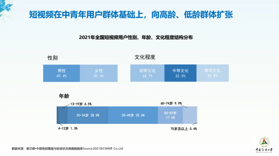 2021年短视频用户结构发生相应变化,呈现出向高龄、低龄群体扩张的主要特点,群体结构趋于完善文化程度方面,短视频用户无明显的群体差异,初等、中等、高等文化用户分别占比34.7%、32.5%和32.8%,初等文化用户数量略显优势。
