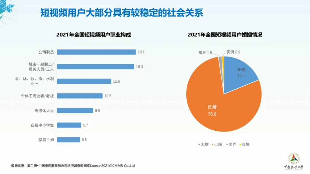 从短视频用户收入情况来看,超五成用户属中等收入人群。婚姻状况方面,已婚用户占比高达78.8%。总体而言,大部分短视频用户社会关系较为稳定,为短视频平台的进一步发展提供了坚实基础和有力条件。