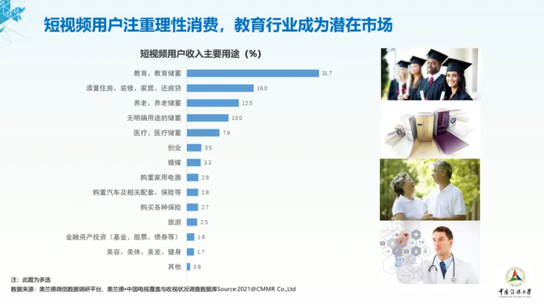 短视频用户消费相对理性,未来消费在教育、养老和医疗基础上,呈现出多元化消费的倾向。平台应引导用户树立正确消费观念,在短视频的普及和品牌的投放中,完成对用户消费习惯跃迁的良性引导。
