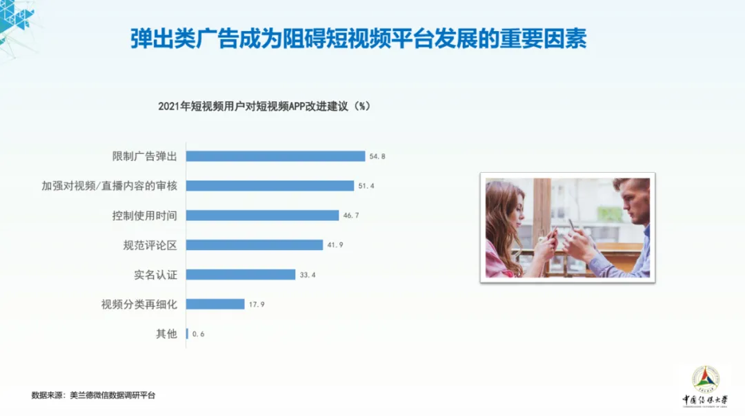 在平台改进措施调查中,54.7%的用户认为广告的弹出是当下短视频平台最应该改进的地方。短视频平台应妥善调整资本结构,对广告发布的无序、混乱等问题进行监管。同时,51.4%的用户认为平台还应加强对视频和直播内容的审核,减少低俗内容的出现,建造良好健康的视频环境。