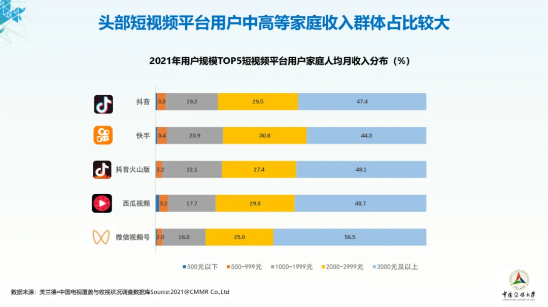 头部短视频用户家庭人均月收入相对较高,各平台家庭人均月收入超过3000元的用户均超过四成,微信视频号中这一态势更为明显,56.5%的用户家庭人均月收入超过3000元。