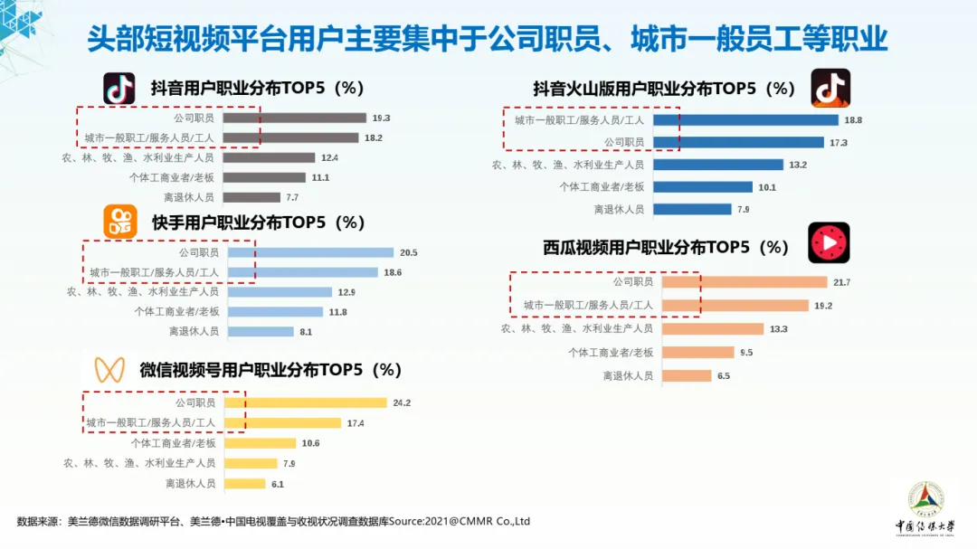 短视频用户学历上未呈现出明显分层,文化程度整体处于中上等水平,微信视频号的高等学历用户较为集中。头部短视频用户主要集中在公司职员、城市一般职工、农林牧渔水利业生产人员、个体工商业者等职业。其中,公司职员和城市一般职工是短视频用户从事较多的职业,在各平台均占据前两位。